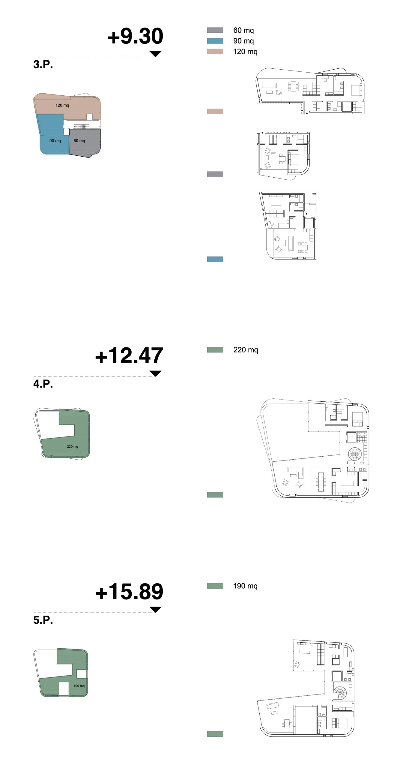 Ci viene richiesta un’importante varietà nel taglio degli appartamenti. Il progetto prevede un attico duplex e dodici appartamenti che si intersecano ai diversi piani dinamicamente.