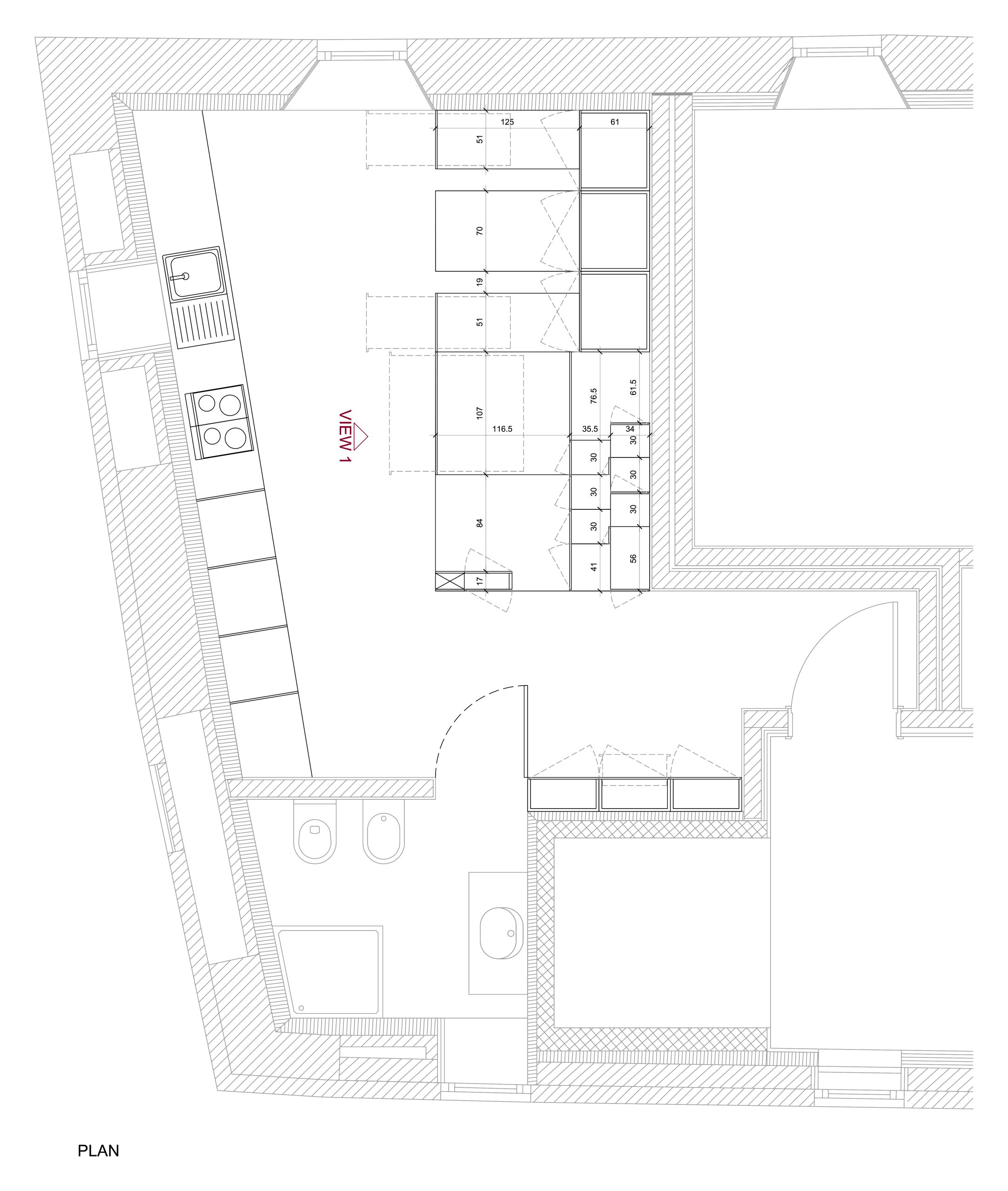 Questa semplicità apparente è in realtà una complessa serie di incastri e interconnessioni di piani e di volumi, che risolvono tutti gli aspetti funzionali richiesti e danno una forte identità al monolocale.