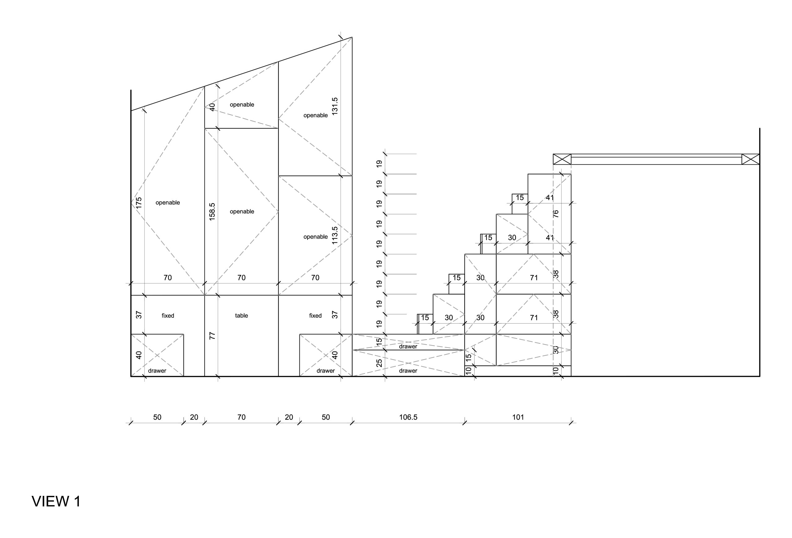 Il progetto vive di una semplicità apparente. Tutto è progettato per massimizzare la funzionalità: armadi, tavolo e sedie sono integrati nella forma e nella struttura del mobile. La falda inclinata del tetto dell’edificio permette di avere un piccolo mezzanino, dove è integrato il letto.
